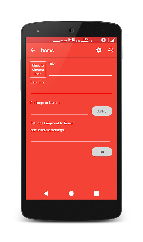 Le premier lancement de cette application va obtenir une liste de tous les paramètres des éléments. Vous pouvez ajouter un en cliquant simplement sur le bouton plus. Vous pouvez supprimer un élément en appuyant longuement sur ou modifier un en cliquant dessus. Vous pouvez modifier le nom, la catégorie, l'icône et application / fragment de lancer. Vous pouvez également modifier l'ordre des articles et des catégories.