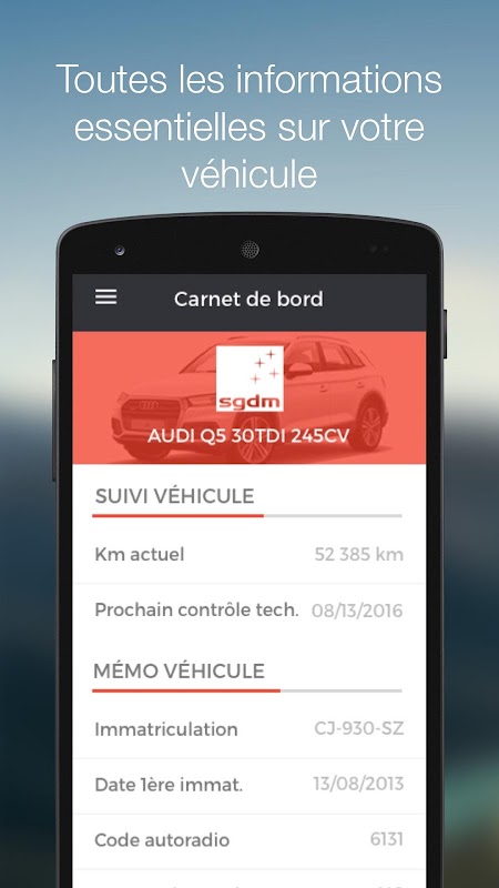 SGDM, l’application Espace Client de votre concession automobile. Un accès simple et sécurisé pour prendre un rendez-vous atelier en ligne, suivre l’état des travaux relatifs à un rendez-vous en cours, accéder aux informations techniques de votre véhicule, consulter l’historique de votre suivi après-vente, recevoir vos factures sous format PDF, contacter votre concession et les services d’assistance.