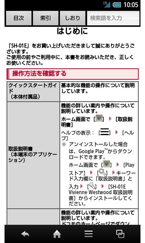 SH-01Eの取扱説明書として、閲覧できるだけでなく、説明文から端末設定などを直接起動することもできる便利な取扱説明書です。