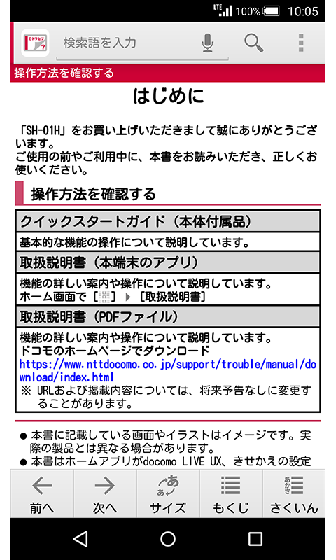 SH-01Hの取扱説明書として、閲覧できるだけでなく、説明文から端末設定などを直接起動することもできる便利な取扱説明書です。
