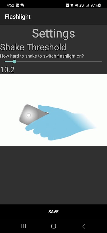 Utilisez secouer et basculer la lampe de poche pour allumer et éteindre facilement la lampe de poche de votre téléphone en la secouant simplement. Vous pouvez définir le seuil de secousse dans les paramètres de l'application en fonction de vos préférences et enregistrer les modifications pour appliquer les modifications.