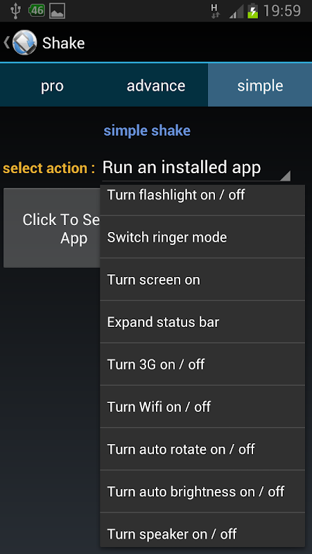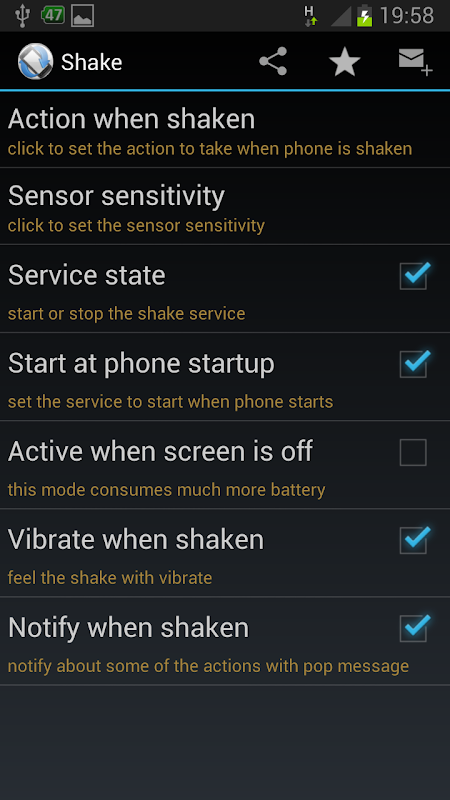 Cette application vous permet de secouer votre téléphone pour déclencher diverses actions! Même si votre écran est éteint, vous pouvez toujours le secouez, et ça va marcher!
