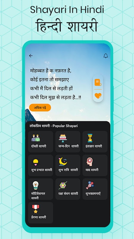 Meilleur journal de Shayari ki en hindi et nouvelle attitude hindi shayari comprend de beaux shayari hindi ou love shayari à partager avec vos amis et votre famille. Application Shayari nouvelle et hors ligne avec les dernières catégories de nouveaux et meilleurs Shayaries.