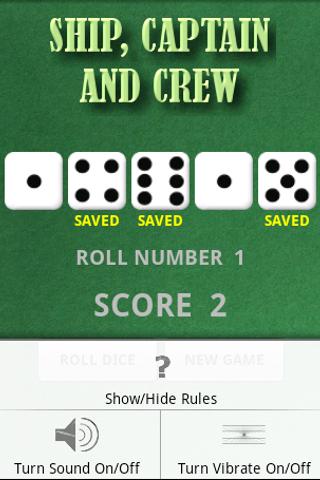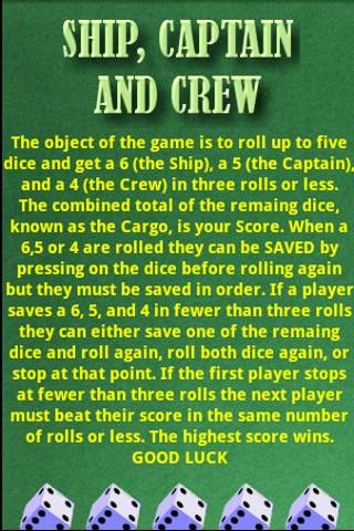 Ship, Captain & Crew est un ancien jeu de bar où les joueurs lancent jusqu'à cinq dés et tentent d'obtenir un 6 (le navire), un 5 (le capitaine) et un 4 (l'équipage) en trois lancers ou moins. Le total combiné des dés restants est votre score. Le score le plus élevé gagne. "BONNE CHANCE"
