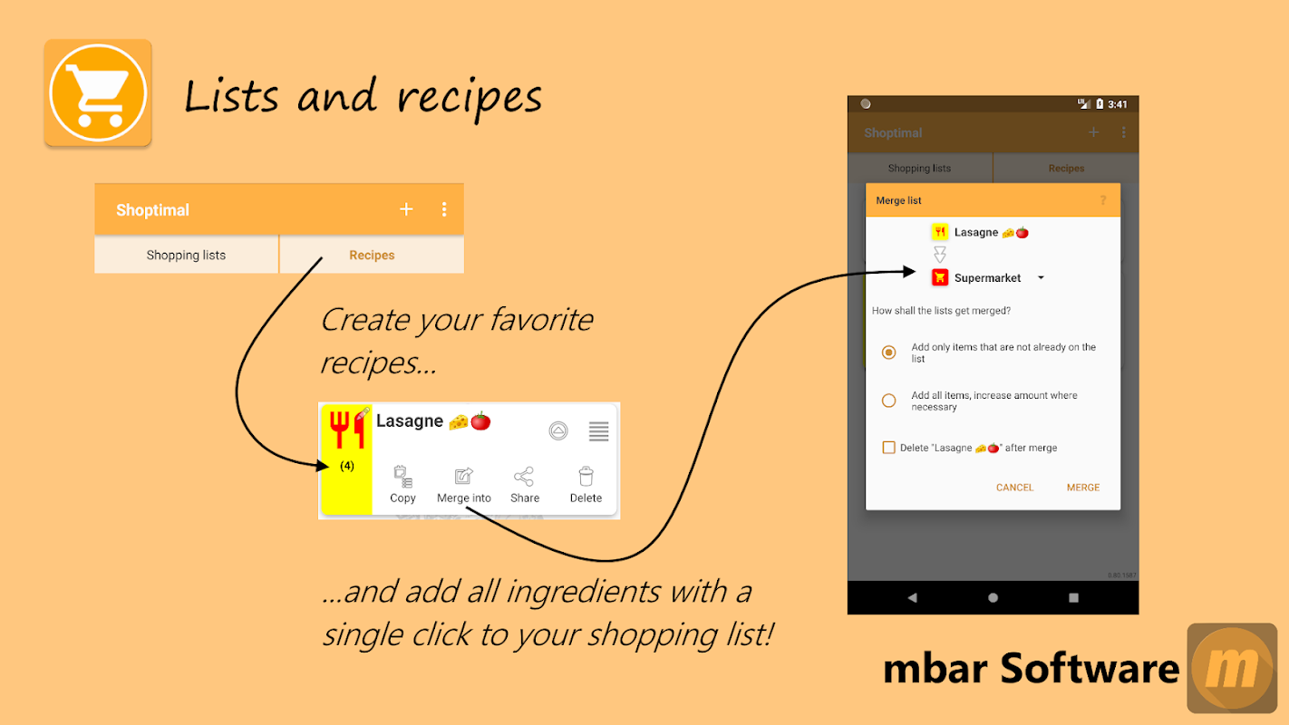 Créez des listes de magasinage uniques avec les ingrédients pour les recettes de cuisine, puis fusionnez-les simplement dans votre liste de supermarchés lorsque vous souhaitez cuisiner une recette spécifique! En seulement quelques clics, vous obtiendrez de superbes listes de courses.