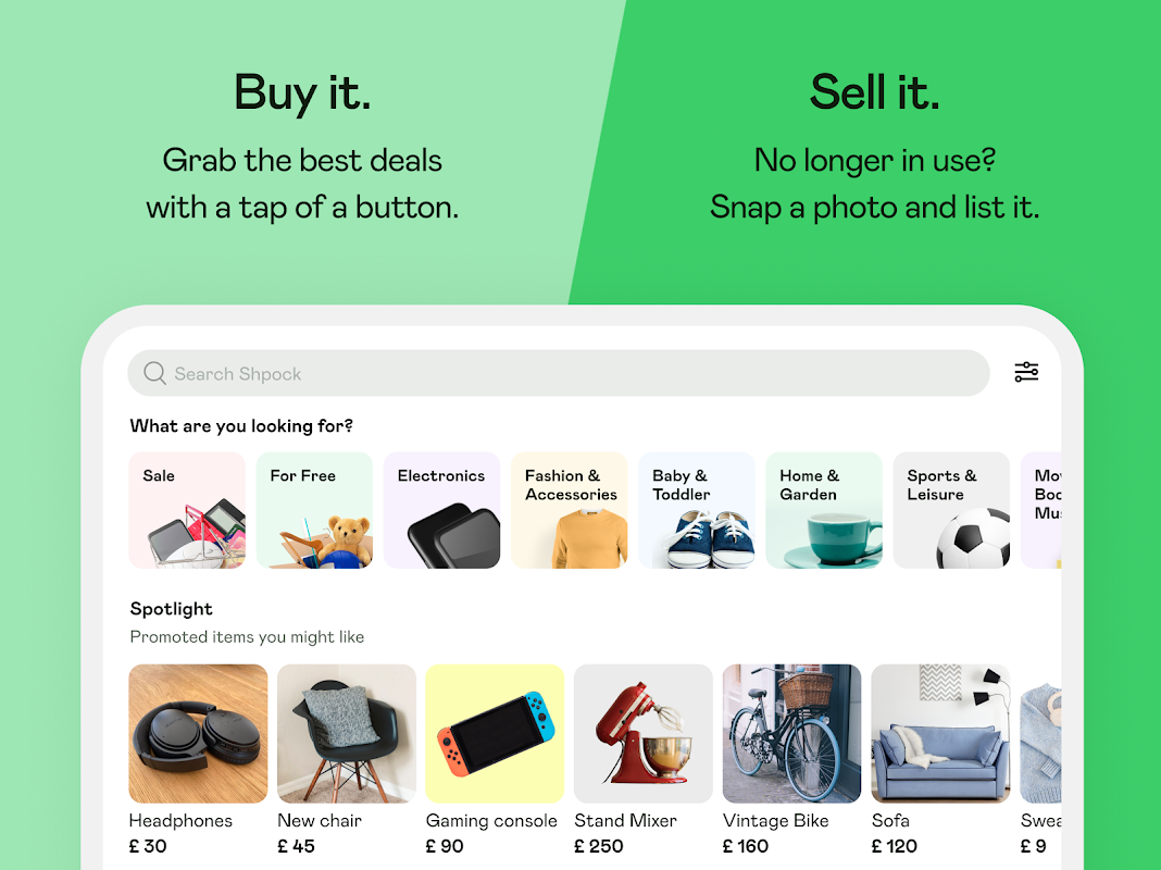 Mode et vintage • Électronique et technologie • Maison et jardin • Enfants et bébés • Sports et loisirs • Voitures et moteurs • Immobilier – et presque tout ce qui vous passe par la tête. Quel que soit votre projet… Shpockez !