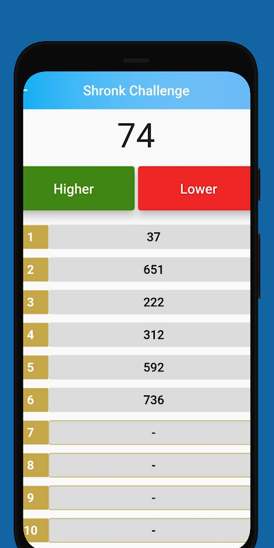 Shronk Challenge est un jeu amusant qui teste votre intelligence et vos capacités de devinettes ! Le jeu a deux boutons et un numéro. L'un des boutons s'appelle "Supérieur" et l'autre "Inférieur" et l'objectif est de prédire si le prochain numéro sera supérieur ou inférieur au numéro précédent, mais l'objectif principal est de bien faire les choses 10, 15 et 20 fois de suite.