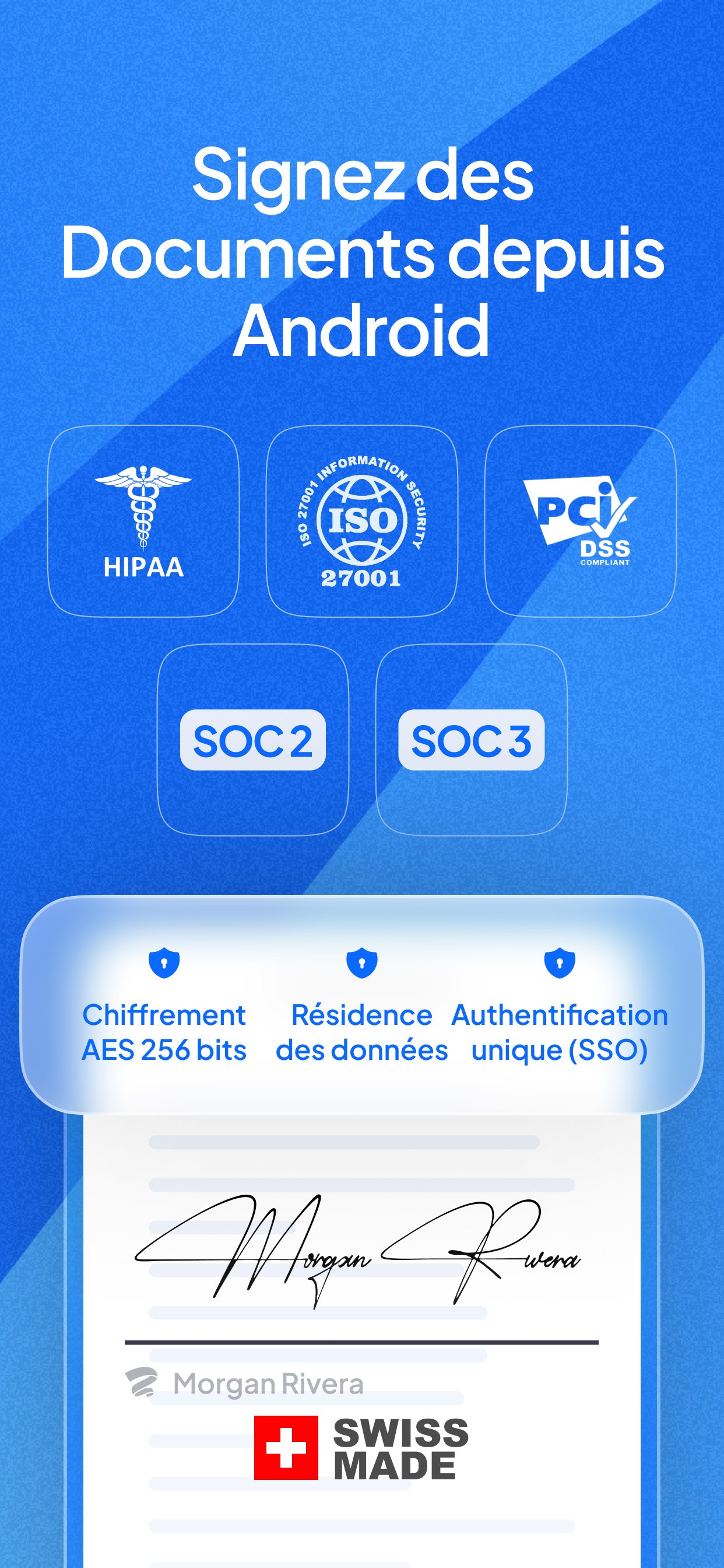 Diverses offres de conformité : nous nous engageons à nous certifier et à certifier notre plateforme de signature électronique pour toutes les certifications et conformités pertinentes, y compris SOC 2, HIPAA, ISO 27001, GDPR, CCPA, etc.