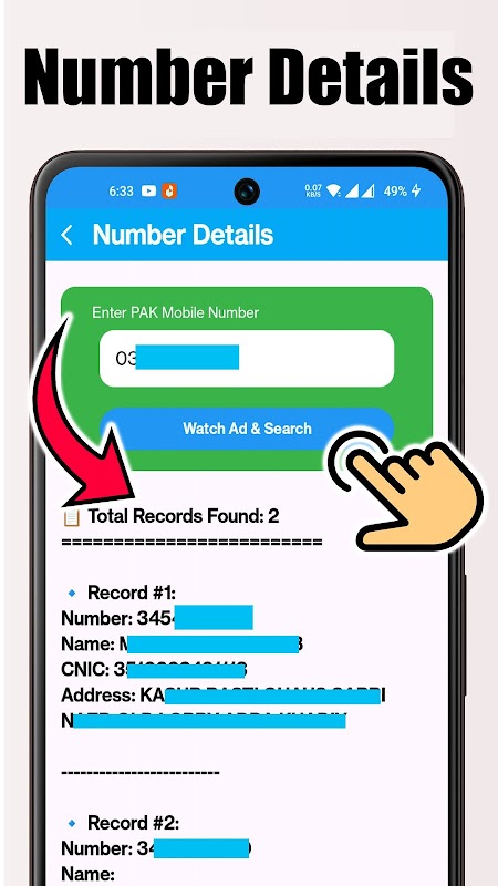 Appuyez sur « Rechercher » pour récupérer instantanément les informations du propriétaire de la carte SIM et les informations CNIC, si disponibles.