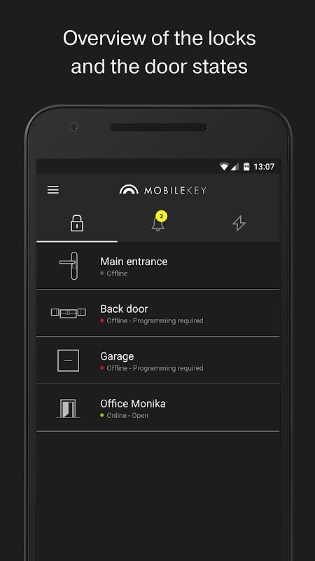 - L’application requiert l'existence de données de connexion valides pour une installation de fermeture MobileKey. Vous devez avoir un compte MobileKey afin de pouvoir utiliser l’application. Une inscription gratuite est possible sur www.my-mobilekey-com.