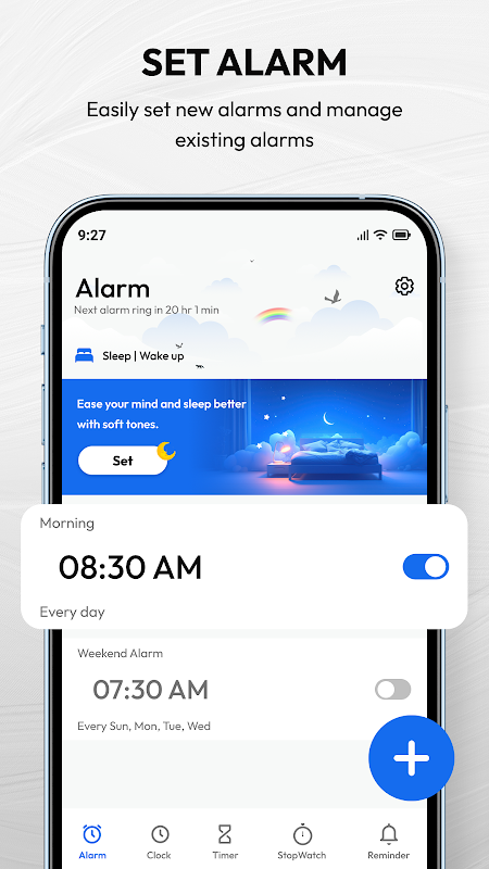 Réglez des alarmes pour vos matinées, vos tâches ou vos horaires de coucher en quelques secondes. Choisissez différentes sonneries, ajoutez des étiquettes et définissez une heure de coucher pour vous aider à vous coucher tôt et à vous réveiller à l'heure. Avec cette application, votre routine de coucher et de réveil sera plus intelligente et plus simple : commencez votre journée du bon pied, chaque jour !
