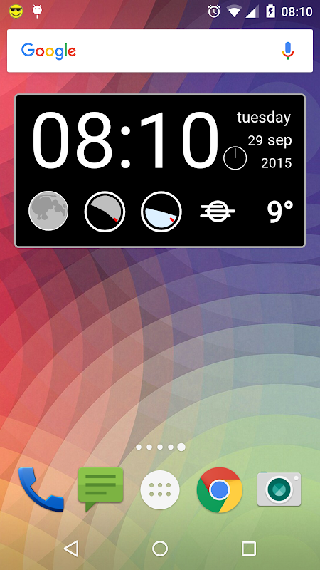 A simple clock widget that displays the current time (with quarter minute indicator), current temperature and weather conditions, the day of the week, day, month and year, the times of sunrise and sunset, the times of moonrise and moonset, and the phase of the moon.