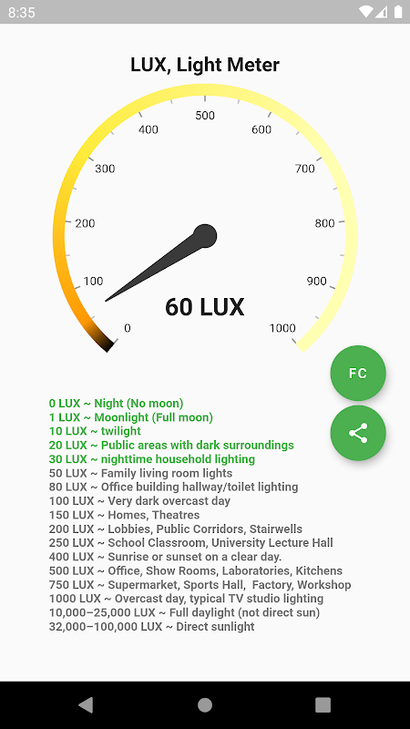 Lux Meter is a simple light meter for measuring illuminances (LUX, FC) by using the light sensor of your android device.