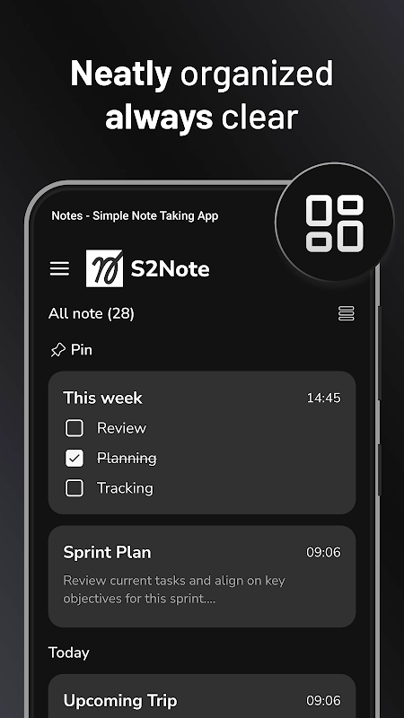 Simple Note est une application de prise de notes légère avec un mode sombre minimaliste qui facilite la prise de notes, de mémos, de listes de tâches et d'idées, où que l'inspiration vous vienne. Cette application simple privilégie la clarté et la rapidité pour vous permettre de capturer vos pensées sans distraction. Utilisez-la comme bloc-notes personnel, agenda ou bloc-notes organisé pour vos cours et réunions : c'est votre compagnon idéal pour la prise de notes.
