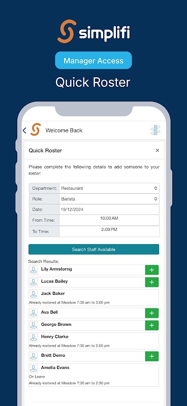 Grâce à Simplifi, les employeurs peuvent effectuer des contrôles de présence en temps réel, modifier rapidement les listes, communiquer directement avec le personnel, publier et pourvoir des emplois occasionnels et bien plus encore, que vous soyez à votre bureau ou en déplacement.
