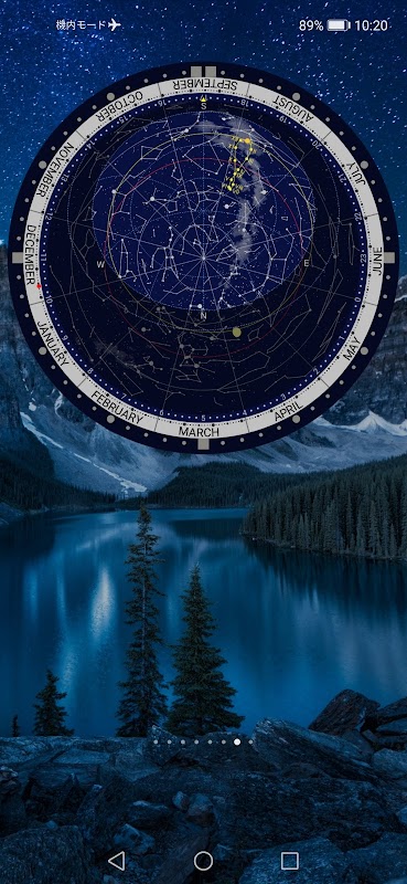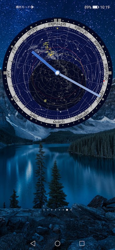 Il s'agit d'un widget d'application d'horloge avec un planisphère pour Android. Le planisphère montre le ciel actuel à l'emplacement d'observation en définissant la latitude et la longitude. Vous pouvez basculer les hémisphères célestes nord et sud. Cette application n'a pas de publicité, mais vous ne pouvez pas choisir la date et l'heure de l'observation. Le nom de l'application a été changé en avril 2023.
