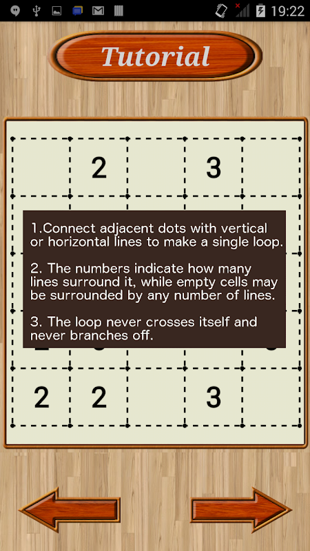 Pour résoudre le casse-tête, connectez les points adjacents horizontalement et verticalement afin que les lignes forment une seule boucle sans extrémités libres. De plus, le nombre à l'intérieur d'un carré représente combien de ses quatre côtés sont des segments dans la boucle. Dans votre boucle finale, chaque cellule doit être entourée d'un numéro spécifié.