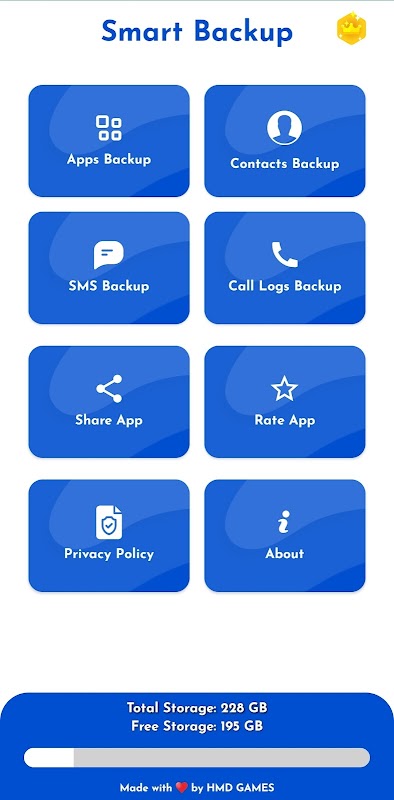 Smart Backup est une application de sauvegarde innovante et intuitive conçue pour protéger vos précieuses données sur votre appareil Android. Avec une variété de fonctionnalités, y compris la sauvegarde APK, la sauvegarde des contacts, la sauvegarde des SMS et la sauvegarde des journaux d'appels, Smart Backup garantit que vos informations importantes sont toujours en sécurité et facilement récupérables.