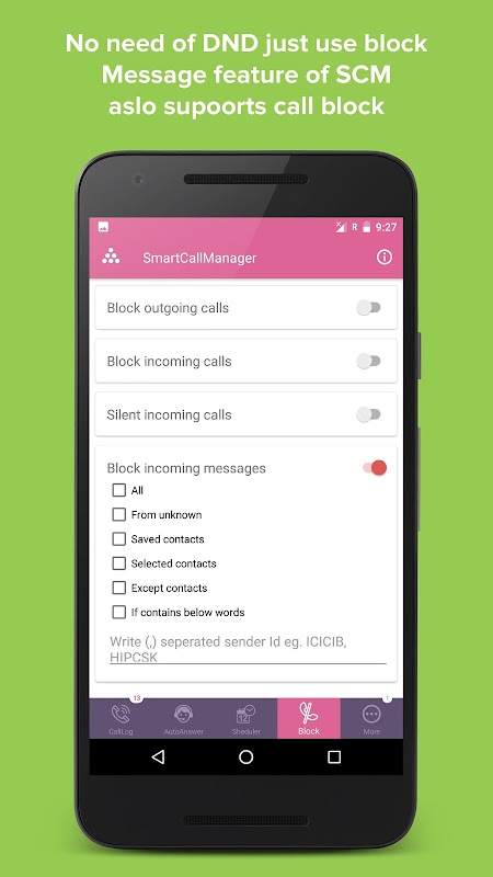 Now no need of activating DND to your SIM, SCM provide you to block incoming messages from any-number or any sender-id just make a setting and unwanted messages will be stopped and any time you can make setting to get it again, even though you block incoming messages and later you want to see which all messaged were blocked you can see in list.