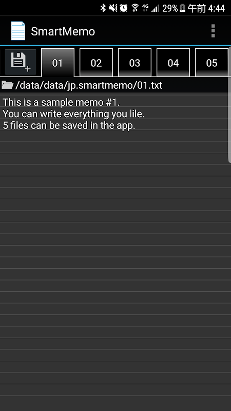 SmartMemo peut lire / écrire des fichiers texte sur une carte SD et conserver 5 mémos dans l'application.