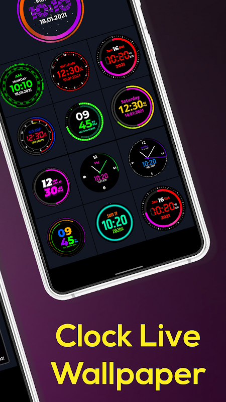 Différentes catégories d'horloges sont disponibles, comme les horloges analogiques, les horloges numériques, les horloges LED, les horloges intelligentes, les horloges animées, les horloges emoji, avec des fonds d'écran d'horloge en direct.
