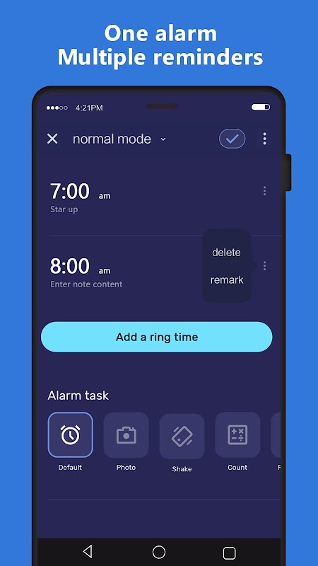 ⏰One Alarm: Set an alarm with multiple reminders at various intervals for simplicity, saving the hassle of creating several alarms for the same purpose.