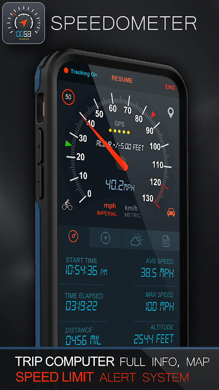 This application is a GPS-based most accurate (we create speedometers since 2010) - Switch between car speedometer and bike cyclometer. - High low speed limit alert system - HUD Mode Switch between mph or km/h mode. - Imperial and Metric unit settings. - Speed calibrate refresh button. - GPS accuracy indicator. - GPS distance accuracy indicator. Track information - Start time. - Time elapsed. - Distance. - Average speed. - Max speed. - Altitude. - Time tracking. - Tracking location on map. - Ability to turn tracking off/on. - Longitude, latitude coordinates. Map integration - Satellite maps mode. - Hybrid maps mode. - Standard maps mode. - Tracking location changes trajectory. Share - Start, end points, coordinates link email sending - Map screenshot email sending .Weather - Temperature information. - Wind - Visibility - Sunrise,Sunset - High/Low Temperature.
