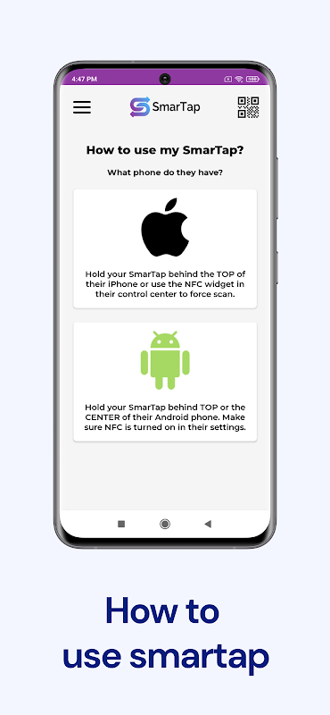 Pour partager un profil, appuyez simplement sur la balise NFC sur un téléphone doté de NFC ou laissez quiconque scanner votre code QR intégré à l'application. Assurez-vous que les téléphones Android ont activé NFC dans les paramètres. D'autres n'auront pas besoin de l'application ou d'un SmarTap pour recevoir vos informations.