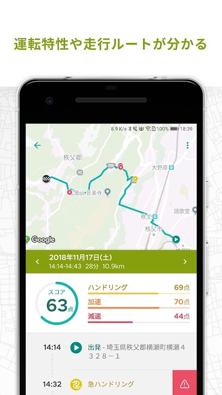 運転ごとの急ハンドル・急加速・急減速のスコアを表示。どの操作が悪いのか、どこで急操作があったのかを知ることができます。