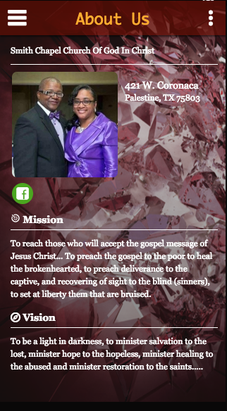 Cette application a été conçue exclusivement pour Smith Eglise Chapelle de Dieu dans le Christ.