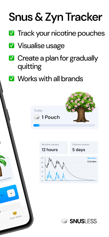 Visualisez votre utilisation : visualisez votre utilisation comme une forêt verte qui devient jaune si vous dépassez les limites que vous avez fixées. Ou passez en mode Geek et obtenez des graphiques détaillés de votre consommation et de la manière dont votre corps est exposé à la nicotine.