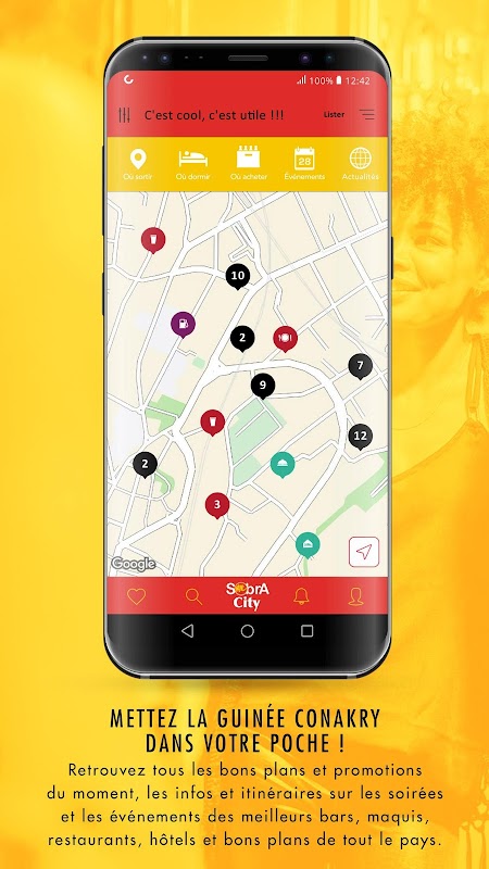 Sobracity est une application développée par la Sobragui pour servir de Guides à ses consommateurs et à tous les utilisateurs guinéens et/ou de passage en Guinée. Elle contient toutes les informations utiles pour acheter, consommer, dormir, et faire la fête. En claire Sobracity permet à ses utilisateurs de retrouver facilement tous les points de vente; c'est à dire les cafés, Bars, Hotels, Restaurants, et Discothèques partout en Guinée. Mieux de s'y rendre facilement avec la fonctionnalité GPS qu'offre l'application.