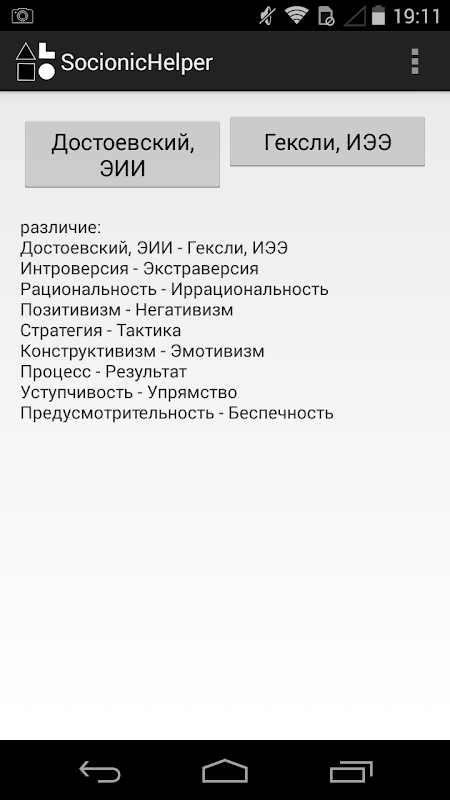 Выбираешь одного и второго. Программа пишет, чем отличаются, т.е. признаки Рейнина, которые разные у этих типов, общее тоже можно посмотреть и список признаков у одного типа. Для большего удобства добавлен список отношений.