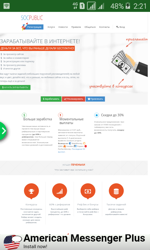 Простой заработок в интернете, за выполнение небольших заданий наших рекламодателей. От простого перехода на