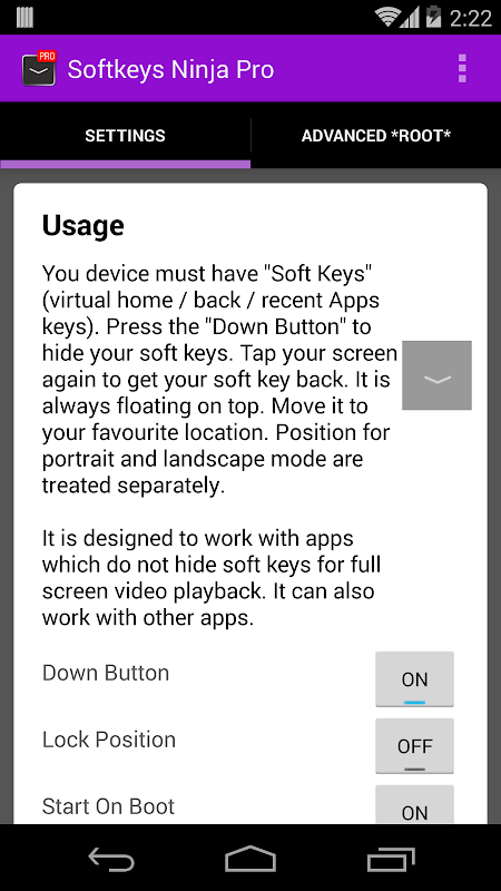 We watch video everyday. Some of video streaming apps is do not hide soft keys (home / back / recent apps key) during full screen video playback. It is very annoying and disturbing. The app add a "Down Button" for selected apps. Users can press this button to hide the soft keys, and enjoy truly full screen video playback.