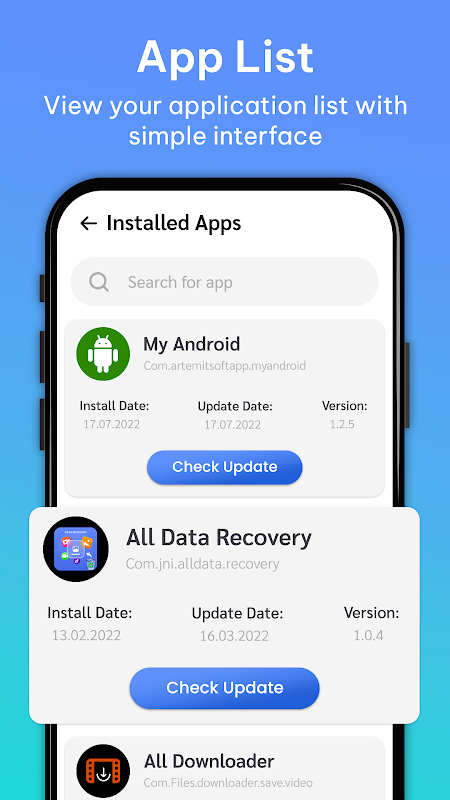 Si votre téléphone peut avoir plus de 50 applications installées et que vous voudrez toujours garder ces applications à jour sur votre appareil. Pour cela, vous n'avez pas besoin de vérifier plusieurs fois les mises à jour de l'application sur le Play Store. Vous pouvez simplement obtenir automatiquement la liste des applications mises à jour à l'aide de la fonction de mises à jour en attente avec cette application de mise à jour du téléphone et mettre à niveau vos applications. Il vous suffit d'ouvrir l'application et de cliquer sur l'application que vous souhaitez mettre à jour dans la liste des applications. La liste est divisée en application installée, application système et mises à jour en attente. Mettez à niveau toutes vos applications et jeux avec une seule touche.