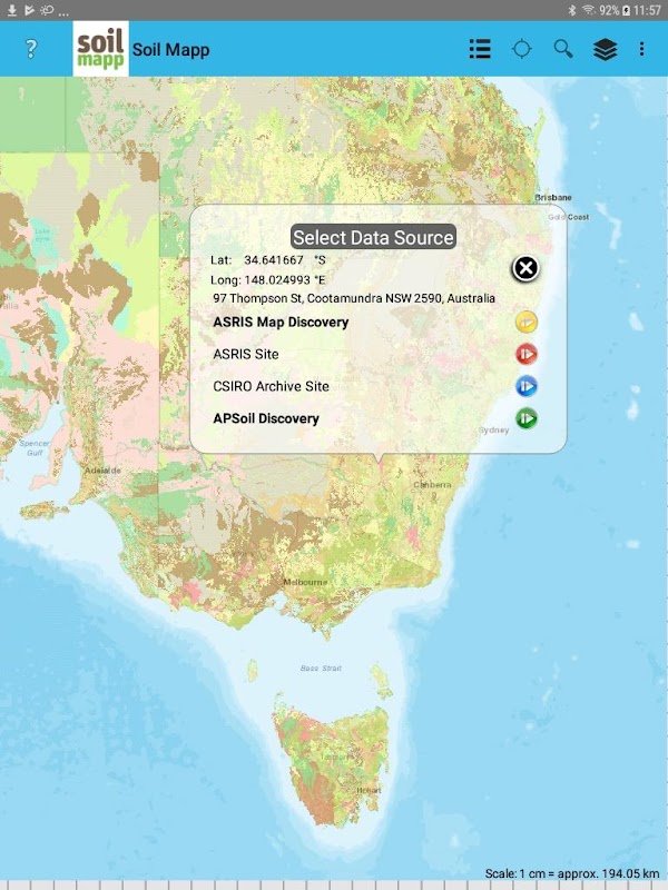 Les utilisateurs peuvent effectuer un panoramique et un zoom sur la carte et appuyer sur pour localiser un lieu d'intérêt, ou utiliser la fonction GPS mobile pour identifier leur position actuelle. SoilMapp renvoie des données et des informations sur les sols probables à l'emplacement défini. Cela comprend des cartes, des photographies, des images satellites, des tableaux et des graphiques de données sur les attributs du sol tels que les teneurs en argile et en carbone organique ou le pH. Les données pour les sites spécifiques décrits et les échantillons conservés dans les archives nationales des sols du CSIRO peuvent également être consultés, le cas échéant. Les sites APSoil fournissent des détails sur les caractéristiques de rétention d'eau du sol et d'autres attributs essentiels pour la modélisation des systèmes d'exploitation.