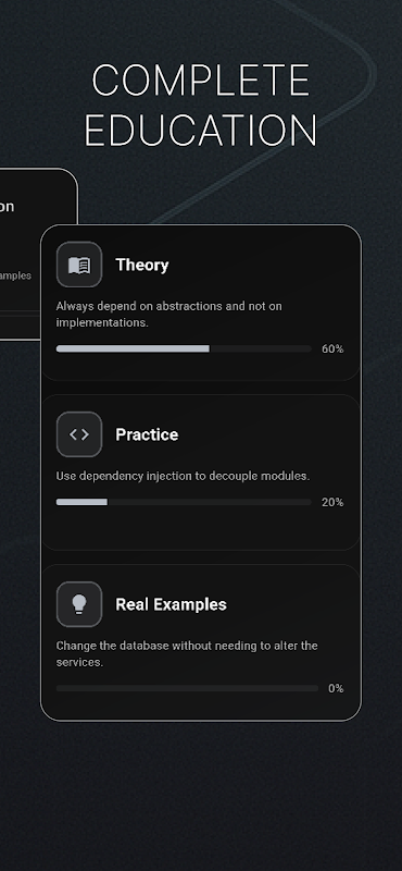 SOLID Architecture est une application éducative conçue pour enseigner les principes SOLID appliqués à l'architecture logicielle, au code propre et aux bonnes pratiques de développement professionnel.