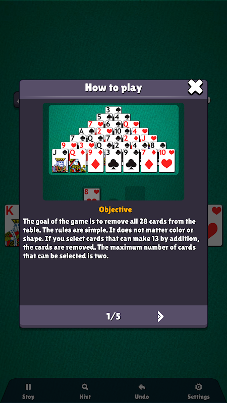 Le but du jeu est de retirer les 28 cartes de la table. Les règles sont simples : la couleur et la forme importent peu. Si vous sélectionnez des cartes dont l'addition peut faire 13, elles sont retirées.