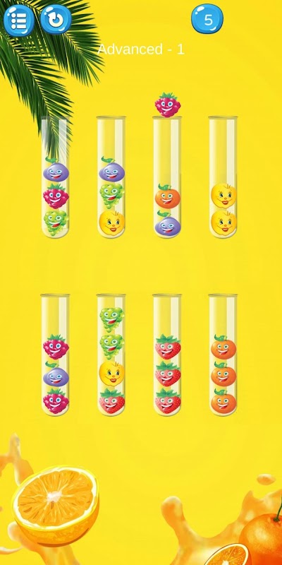 Sort the Fruit in the tube until all the Fruit are grouped to the same type. You will need to sort the Fruit like a ball into the same tube to win the level.