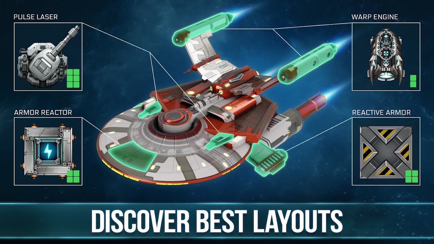 Select your starship and choose from hundreds of parts for building your own modifications! Enjoy fantastic star war battles with other players in strategy war games! Become the top spaceship builder across the galaxy of this space battle game!