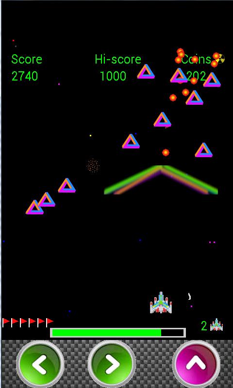You start with a high powered blaster, no shields and are vastly out numbered. Your ship desperately needs upgrades, and you're in luck - collect the falling space money and visit the local weapons shop to get upgraded.