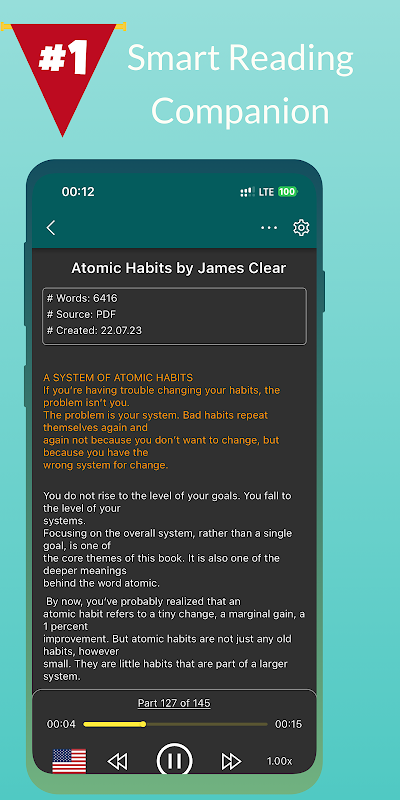 Suivez sans effort pendant que le texte est mis en surbrillance et parfaitement synchronisé avec le lecteur vocal. Lecture et écoute combinées pour une meilleure rétention. Le défilement automatique pendant l'écoute avec la partie active en surbrillance est utile à des fins d'éducation et de productivité.