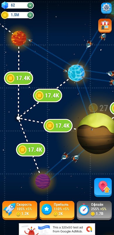 Connect planets with space lanes, earn money, upgrade skills, explore the huge open galaxy.