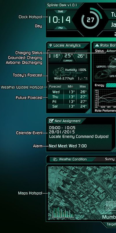 This skin is a complete package containing clock, date, agenda, battery, shortcuts, notifications, weather, temperature, etc.