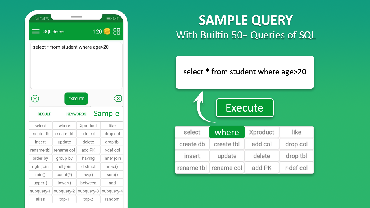L'une des fonctionnalités de support de cette application SQL d'apprentissage est la clé SQL en syntaxe SQL. Le client mysql permet à l'utilisateur d'écrire une requête facilement et rapidement dans l'éditeur de code. Le clavier contient les mots clés utilisés dans la requête SQL pour SQL, les noms de table utilisés dans une base de données donnée et les noms de colonne utilisés dans les tables vous aident à gérer la base de données. Avoir la meilleure expérience par client pratique SQL ou tutoriel SQL et formation Oracle ainsi.