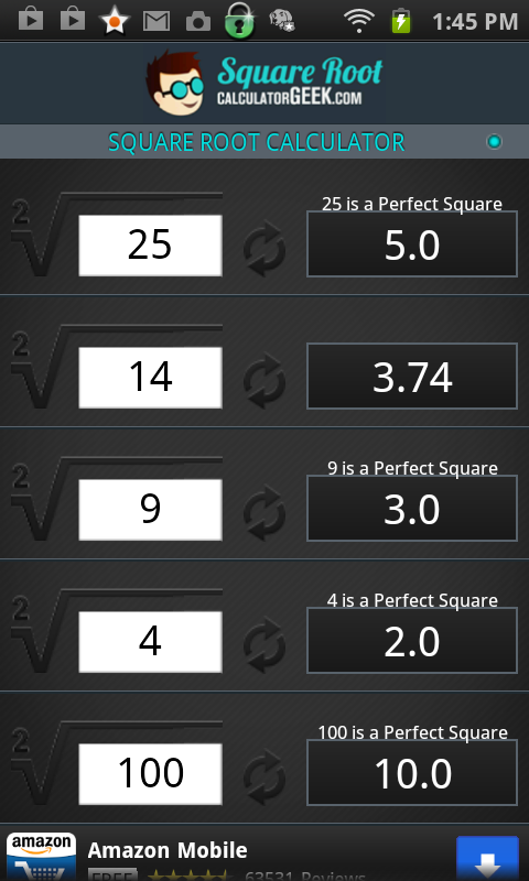 Carrés parfaits sont les carrés des nombres entiers. Cette application va vous conseiller car il calcule si une racine carrée est «parfait»