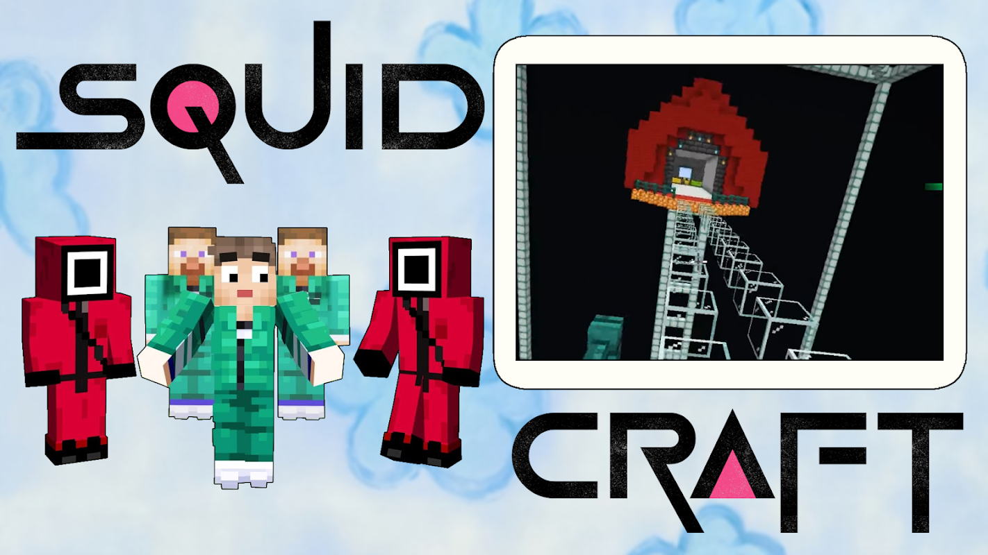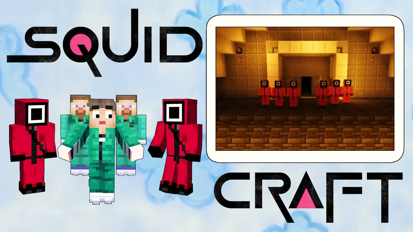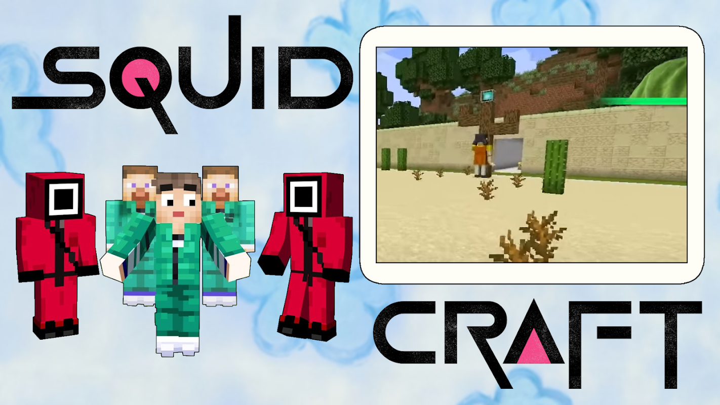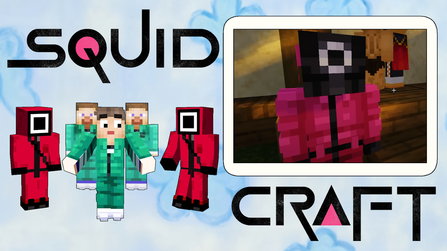 Dès votre entrée dans le monde, vous aurez la possibilité de jouer à un jeu de calamar - c'est un défi dans lequel il ne restera qu'un seul participant ! Le pack de textures vous permettra de vous plonger dans une série d'horreur dans laquelle les enfants jouent avec des punitions pas enfantines. Des foules extrêmement effrayantes ne viendront pas à votre rencontre, mais la complexité des tâches et le manque de temps créeront des tensions et un esprit de compétition. Vous pouvez devenir le héros de la série et vaincre le numéro 456. Appelez vos amis et organisez une aventure intéressante avec eux. Défis d'histoire : Les organisateurs donnent à chaque joueur un numéro et un choix, tout ce que vous avez à faire est de terminer six défis. Chaque test est un mini-jeu, certains sont des nids d'abeilles en sucre, d'autres mettront à l'épreuve votre habileté au tir à la corde. Certains testeront votre chance - il y aura des blocs de verre devant vous, non pas sur du verre trempé, vous tomberez et vous abandonnerez automatiquement la compétition pour des trésors sans précédent. Il y en a aussi un drôle - feu rouge, feu vert - à première vue, cela vous semblera facile, mais ne pensez pas que tout le monde jouera franc jeu, vous pouvez être poussé et la poupée robotique vous indiquera ce qui entraînera des flèches enflammées qui vous jettera automatiquement hors du jeu. Le monde des pixels deviendra encore plus intéressant et mystérieux car vous pourrez vous-même créer de nouveaux jeux. Il y a un jeu de boules et c'est dans celui-ci que vous devez vaincre l'ennemi à l'aide de la ruse et du tour de passe-passe. Les gardes rouges sont armés et il vaut mieux ne pas les mettre en colère, en même temps les survivants ne sont pas très sympathiques, tout le monde veut survivre et gagner. Vous pouvez créer un arbre à partir d'une série de jeux de calmars, ainsi que des soldats qui apparaîtront au hasard dans des biomes aléatoires.