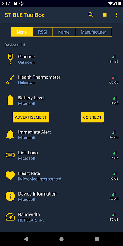 Au lancement, l'application recherche les appareils BLE. Pour chaque appareil trouvé, il est possible d'afficher des publicités et de s'y connecter.