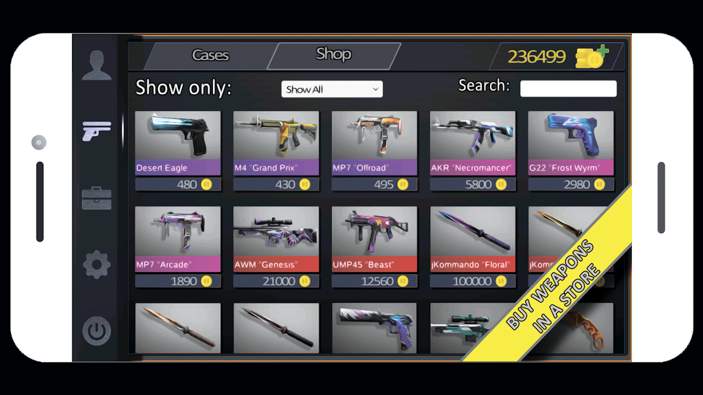 Le jeu a toutes les armes du jeu Standoff. En plus des boîtes et étuis habituels, il existe un étui secret dans lequel l'arme la plus chère est cachée!